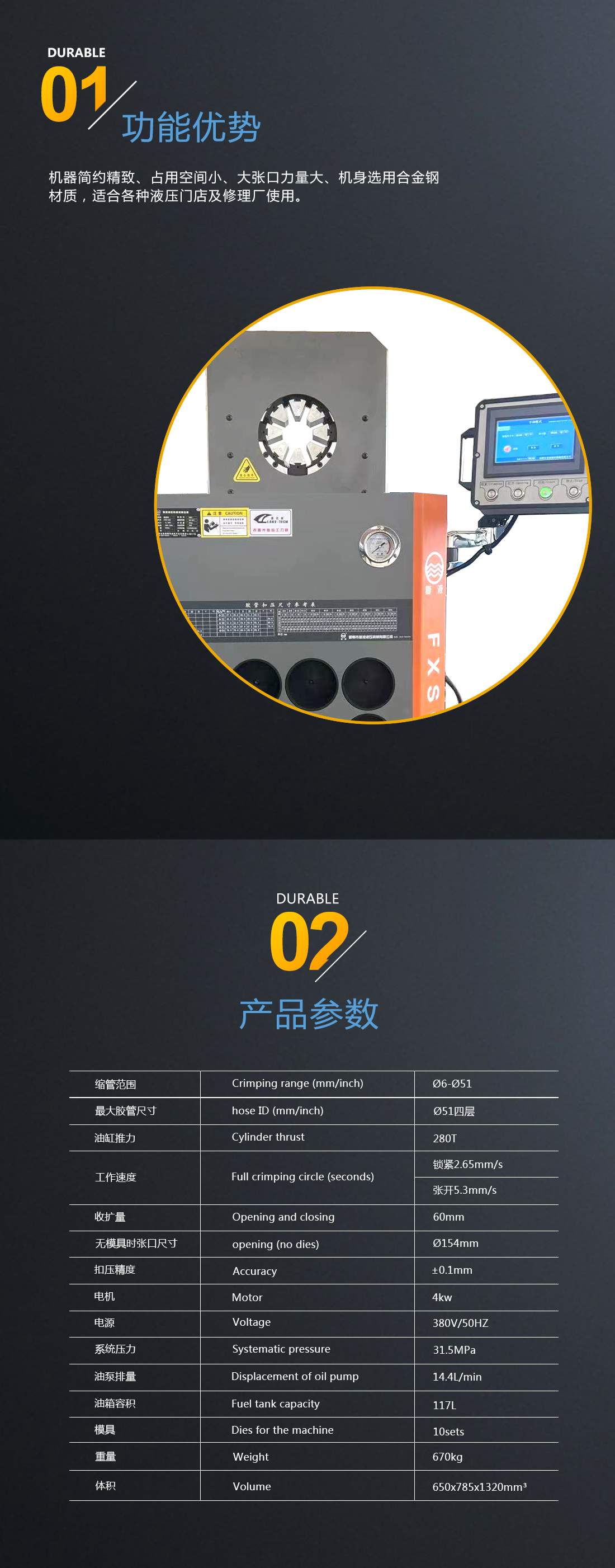我公司新研發(fā)成功了超薄系列縮管機(jī),扣壓重復(fù)精度可達(dá)到0.1mm。超薄的結(jié)構(gòu)形式克服了傳統(tǒng)環(huán)形扣壓機(jī)固有的不足,能夠非常方便的扣壓形狀復(fù)雜的高壓油管總成和異型軟軸軟管。此款機(jī)器外觀尺寸更小,采用人性化設(shè)計(jì),更方便使用者操作??刂葡到y(tǒng)采用的是PLC+觸摸屏模式,位移傳感器采集信號精度高,系統(tǒng)可采用手動、半自動和全自動三種模式,用戶可根據(jù)實(shí)際加工的工況非常方便的進(jìn)行選擇,從而大大提高加工效率。在您使用的過程中如遇到有不方便之處請及時與我們聯(lián)系,我們將以不懈的努力提高您的產(chǎn)品質(zhì)量和工作效率。